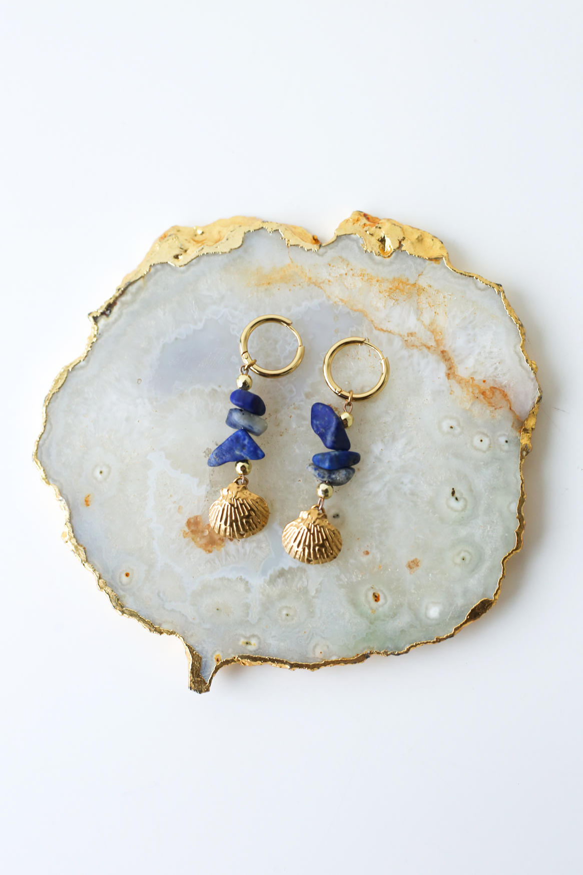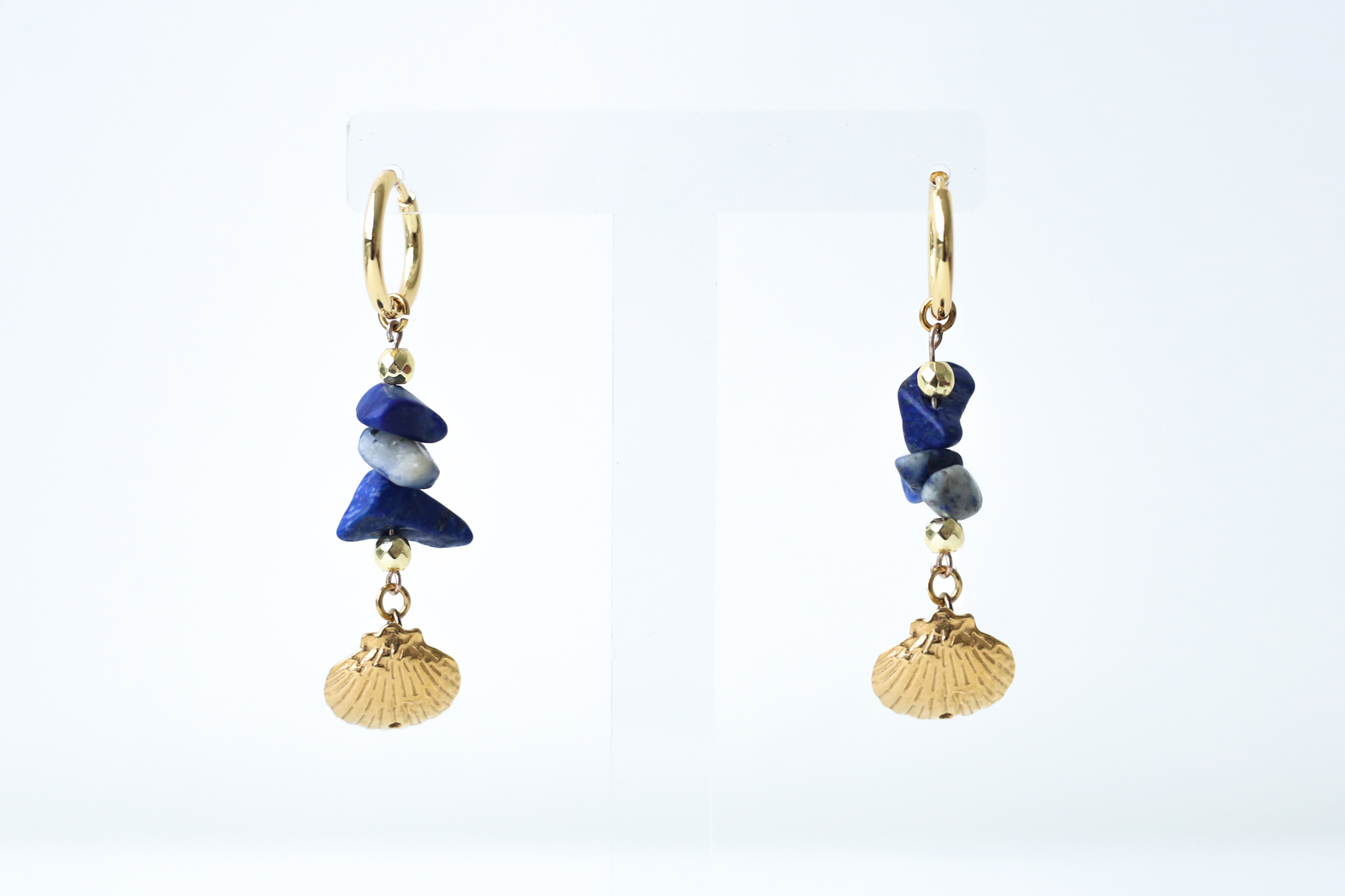 Deep blue stones meet golden details and shell elements, capturing a summer moment by the sea.