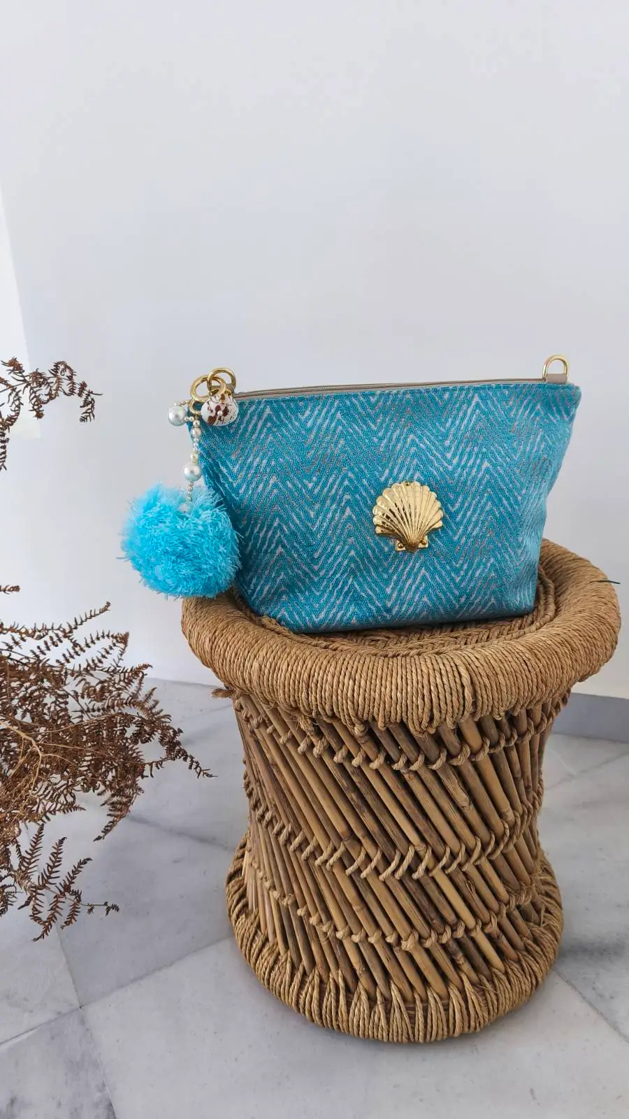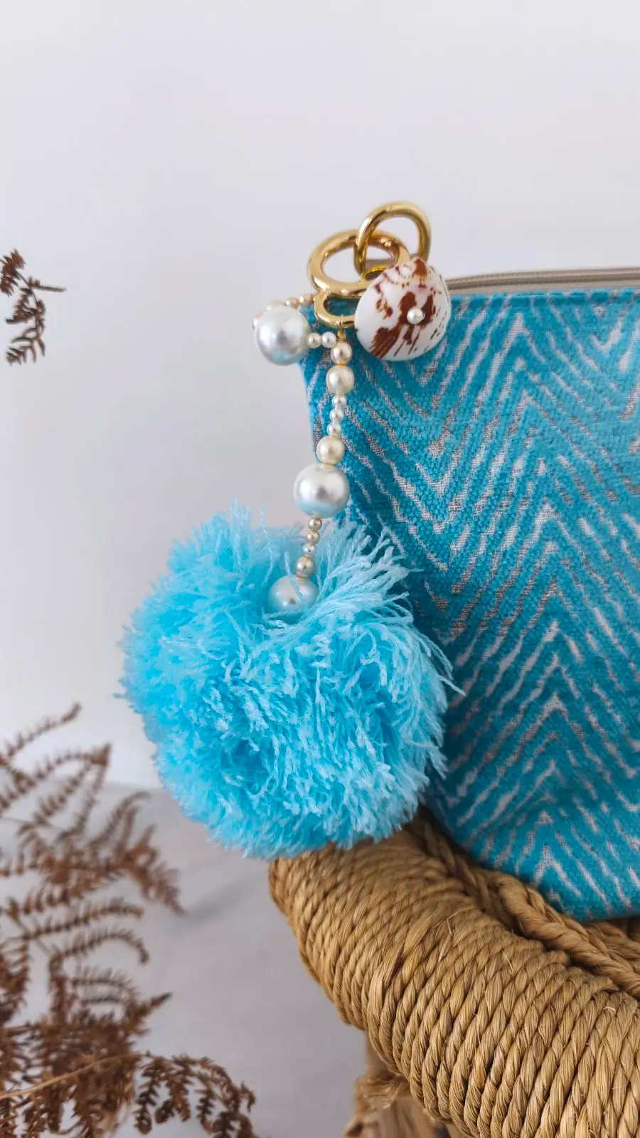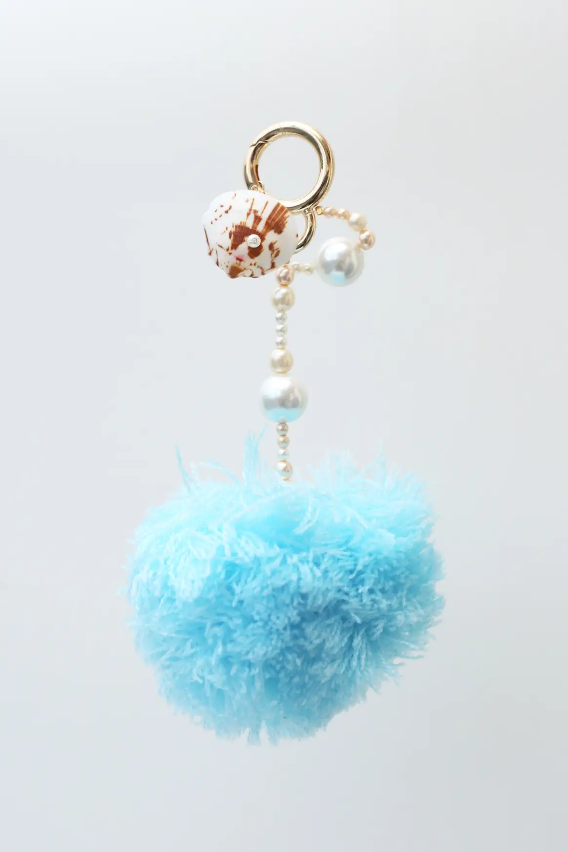 This sculptural bag charm blends organic coastal elements with playful volume. Natural shells and luminous pearls create texture and depth, while the oversized pom pom, introduces movement and bold character. The result is a refined yet expressive piece that transforms a handbag or key set into a curated style detail.