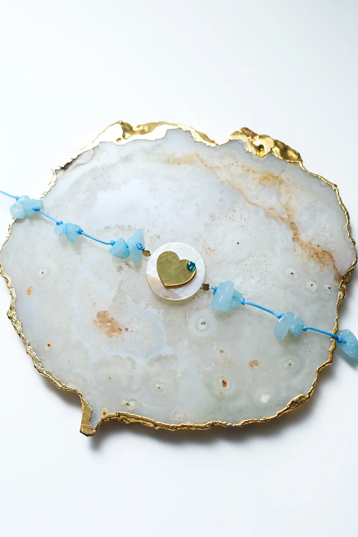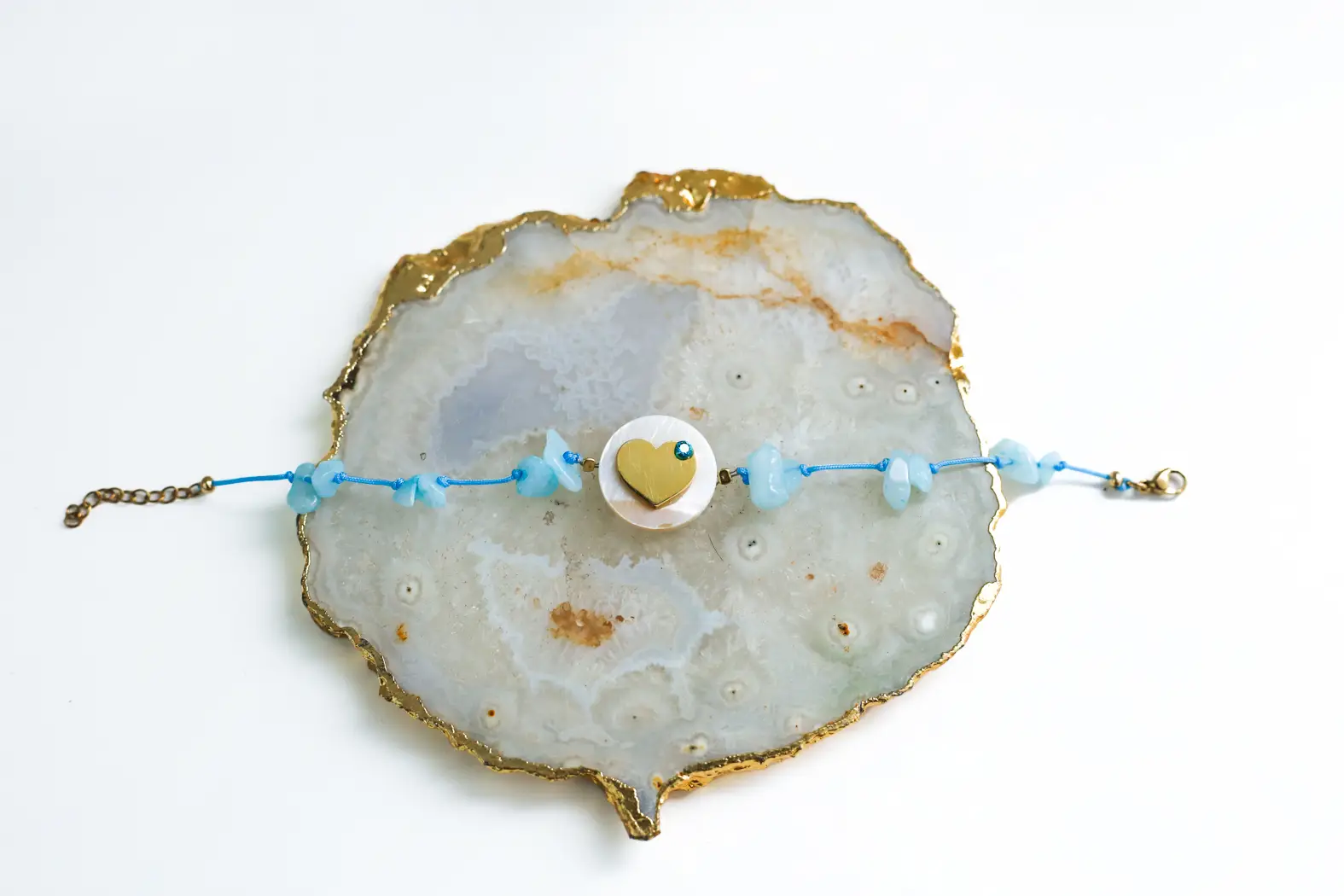 Elegant cord bracelet with natural chip stones and a gold plated stainless steel heart, highlited by a small zircon stone that adds refined shine.