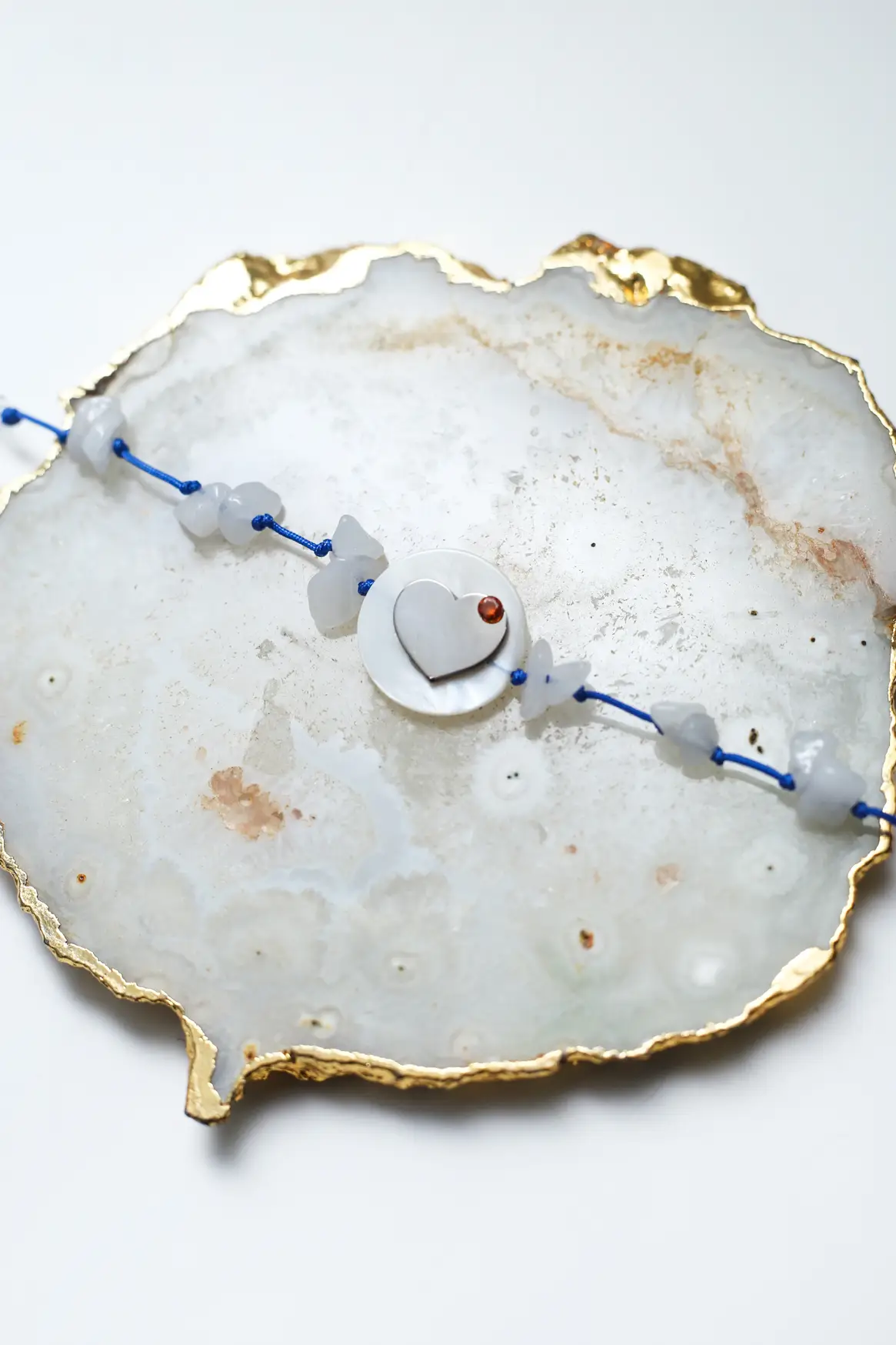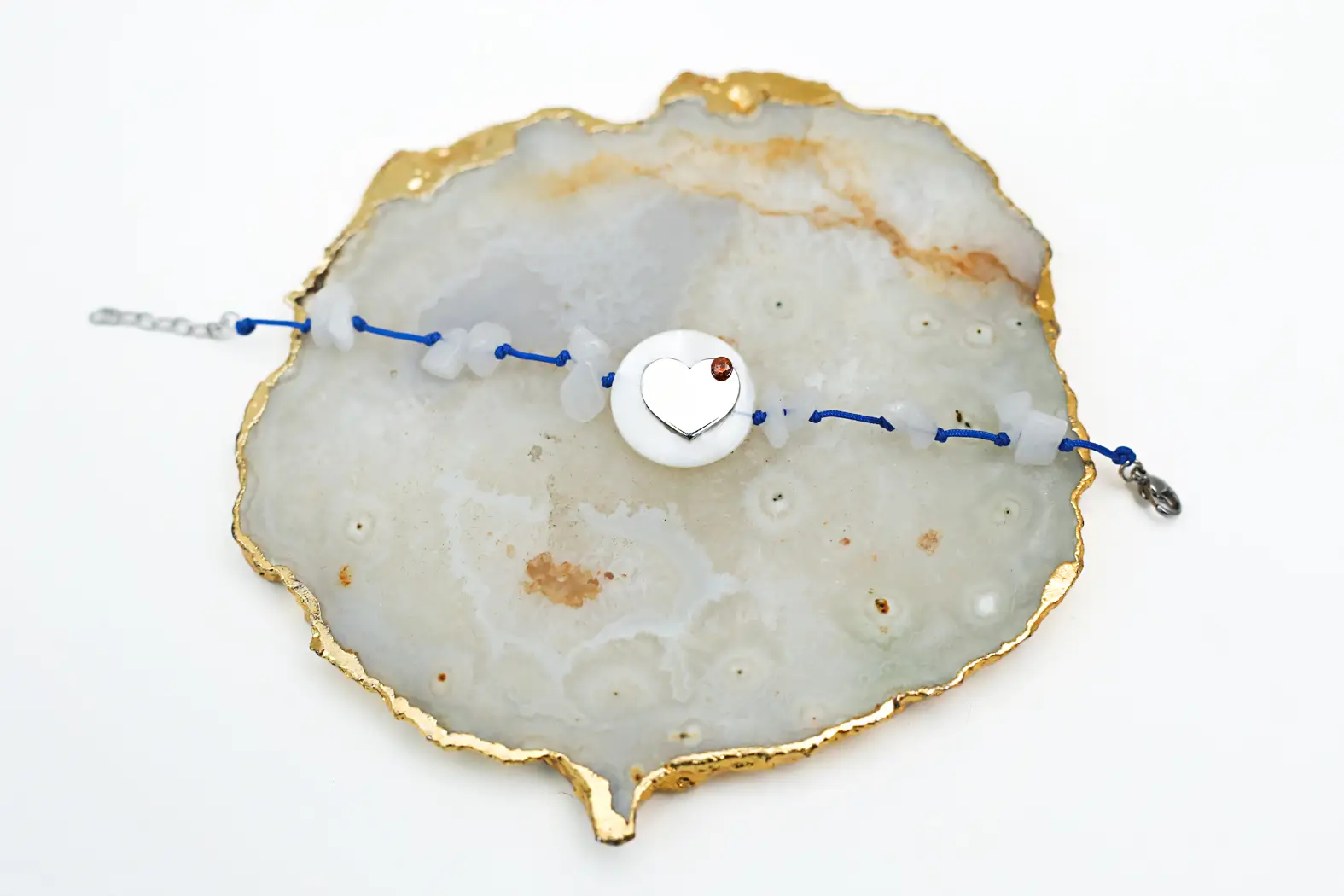 Elegant cord bracelet with natural chip stones and a  stainless steel heart, highlited by a small zircon stone that adds refined shine.