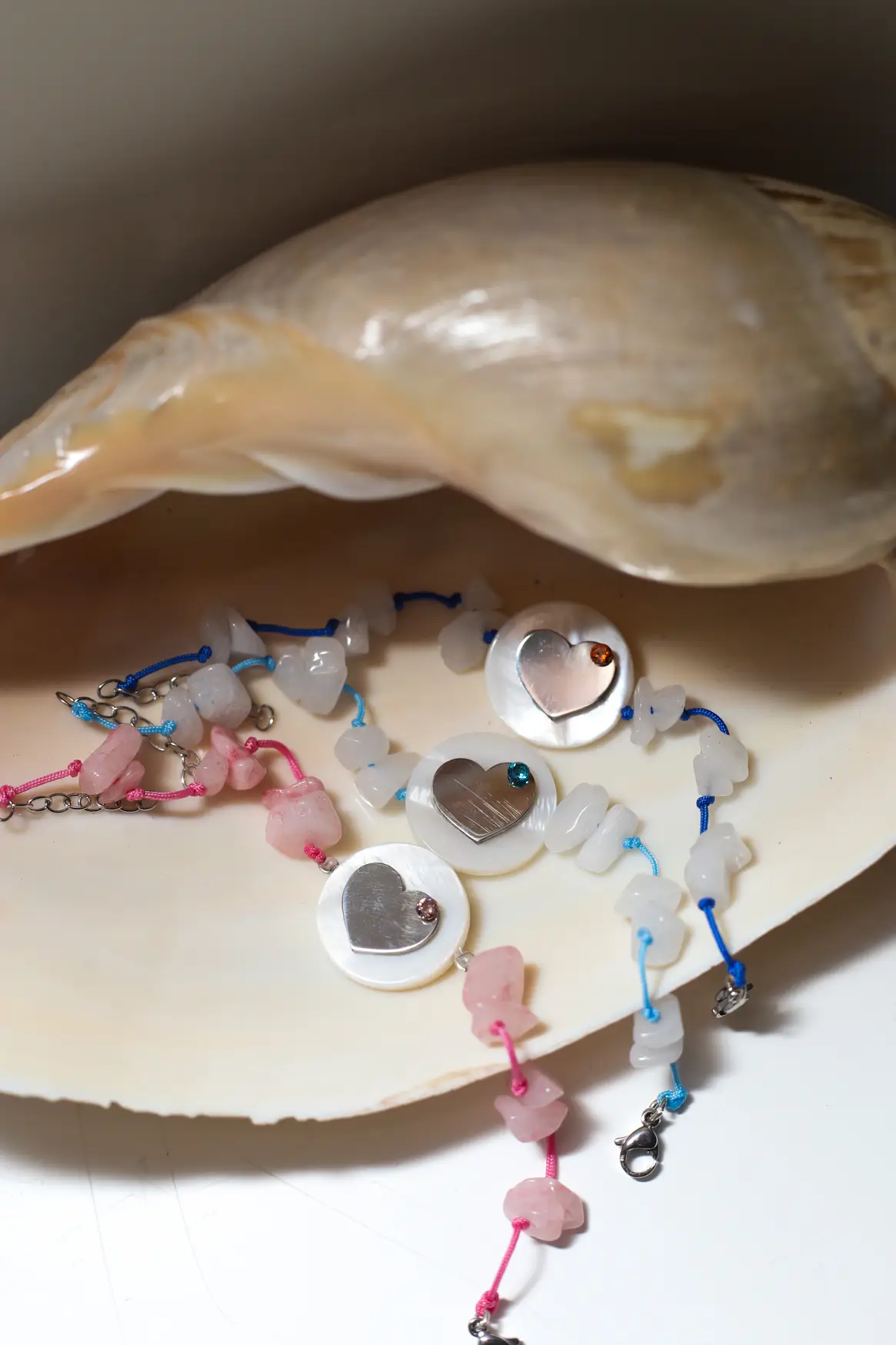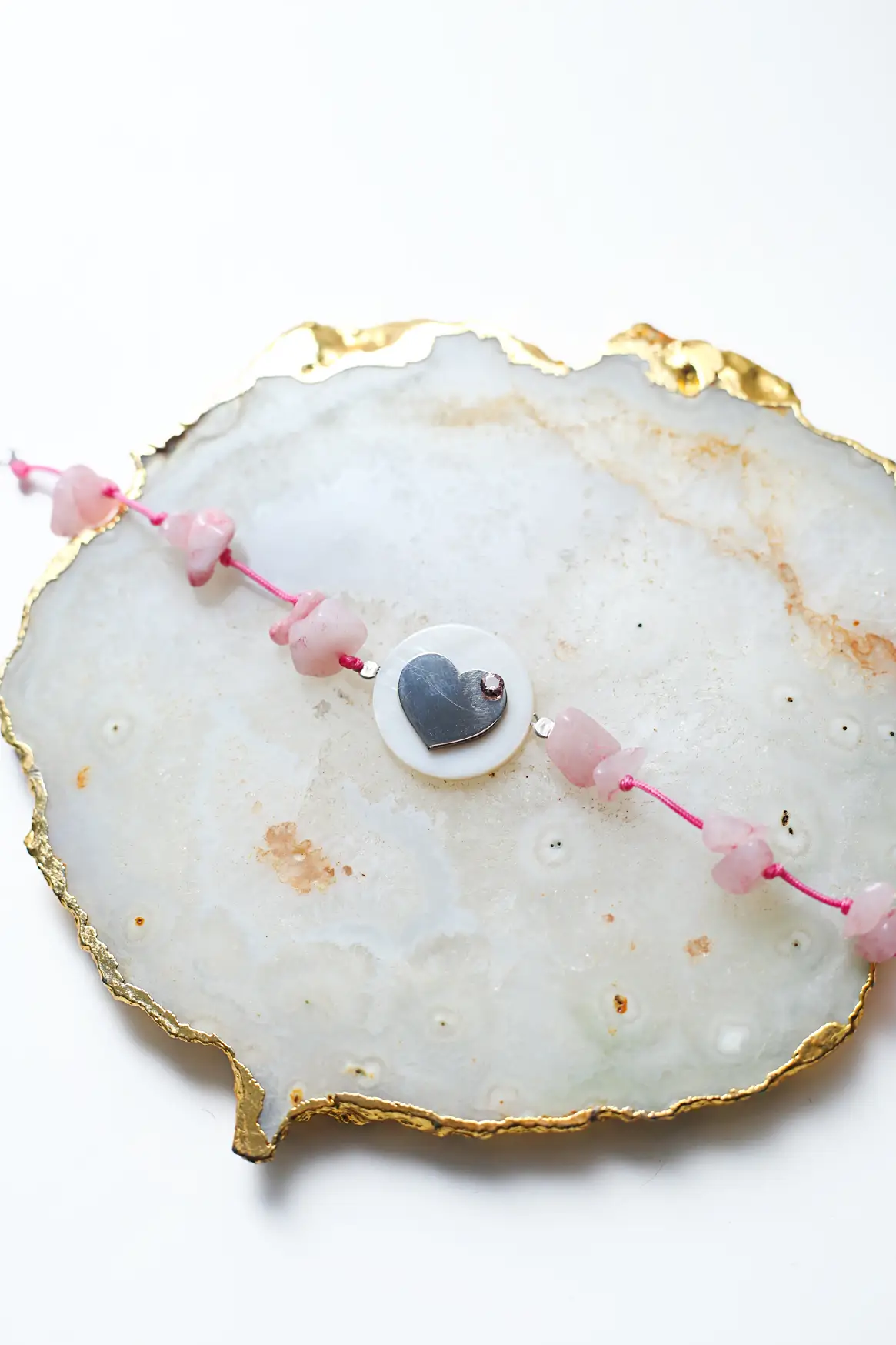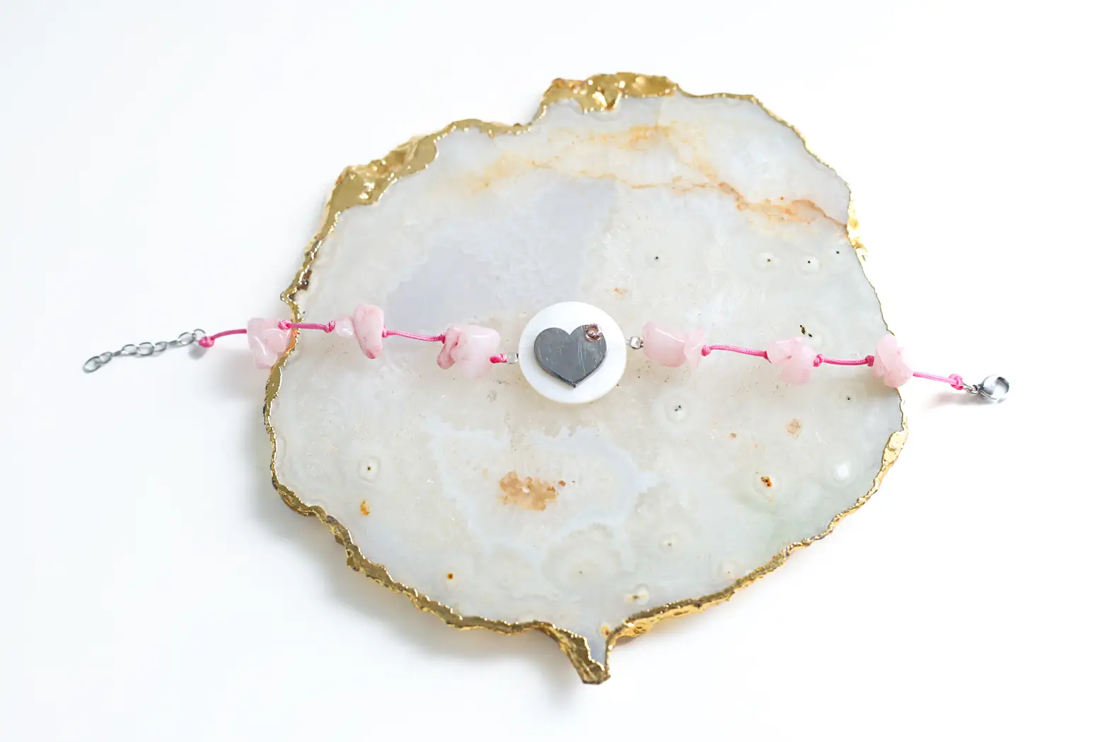 Elegant cord bracelet with natural chip stones and a  stainless steel heart, highlited by a small zircon stone that adds refined shine.