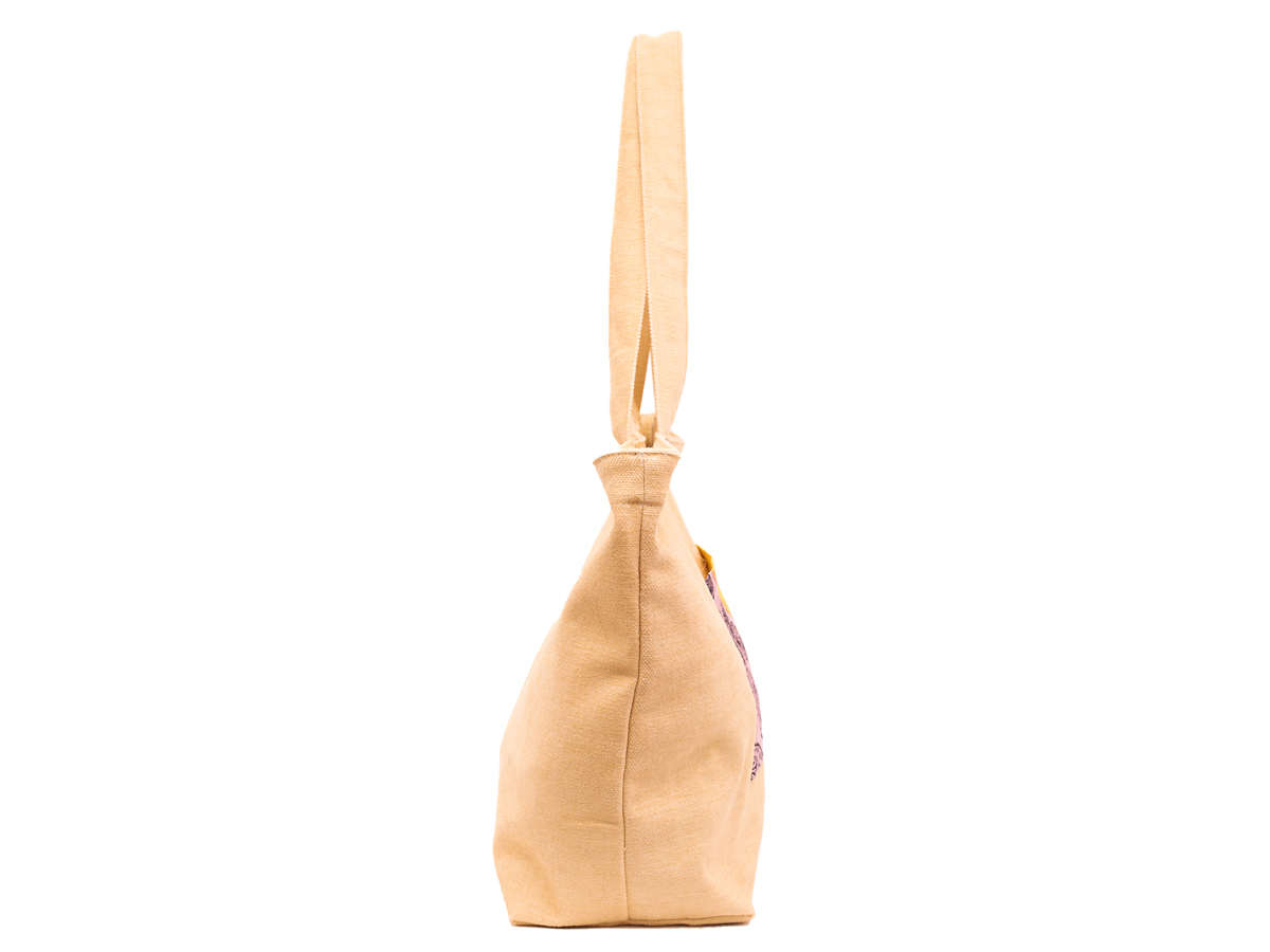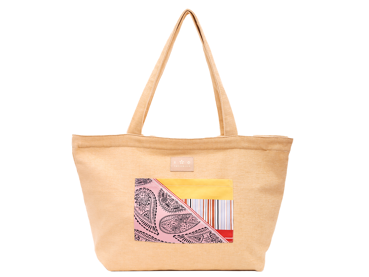 A fresh and lightweight tote designed for warm, sunny days. Crafted from soft summer fabric in a warm beige tone, this bag combines practicality with a playful aesthetic through its unique front pocket featuring mixed patterns and vibrant colors. Perfect for everyday use, it offers a spacious interior and easy access design, making it ideal for quick, on the go moments.