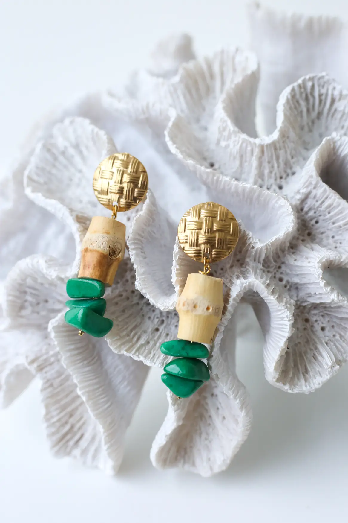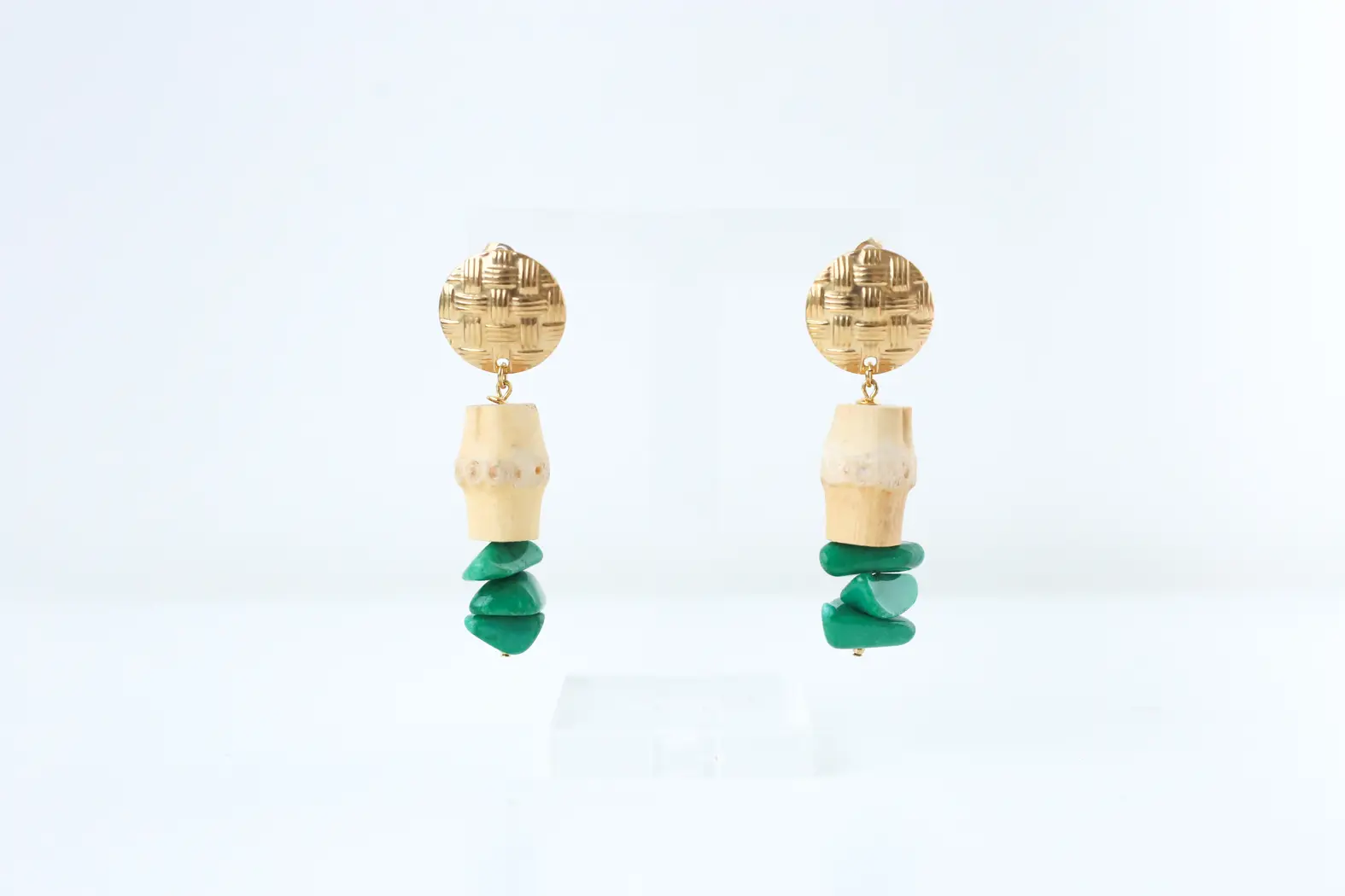 Gold tone textured stud combined with natural bamboo detail and chips green stones.