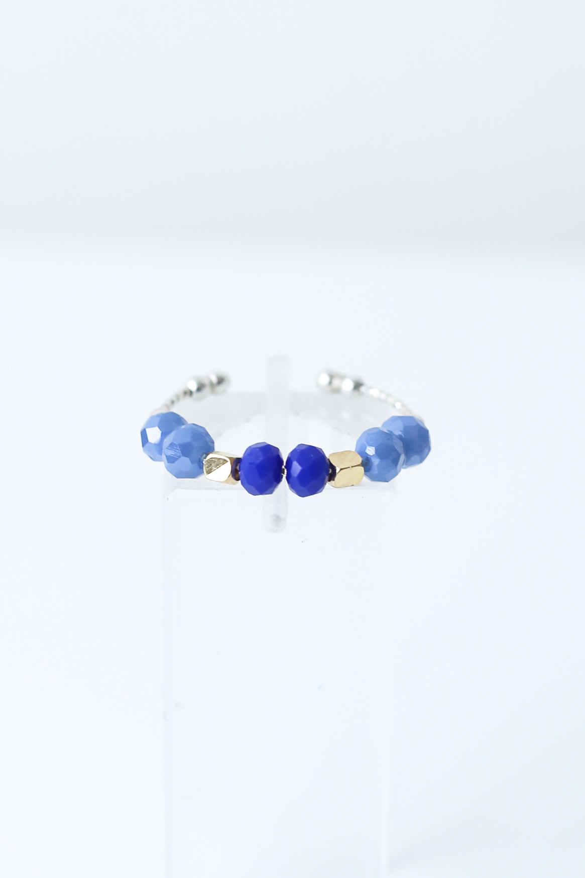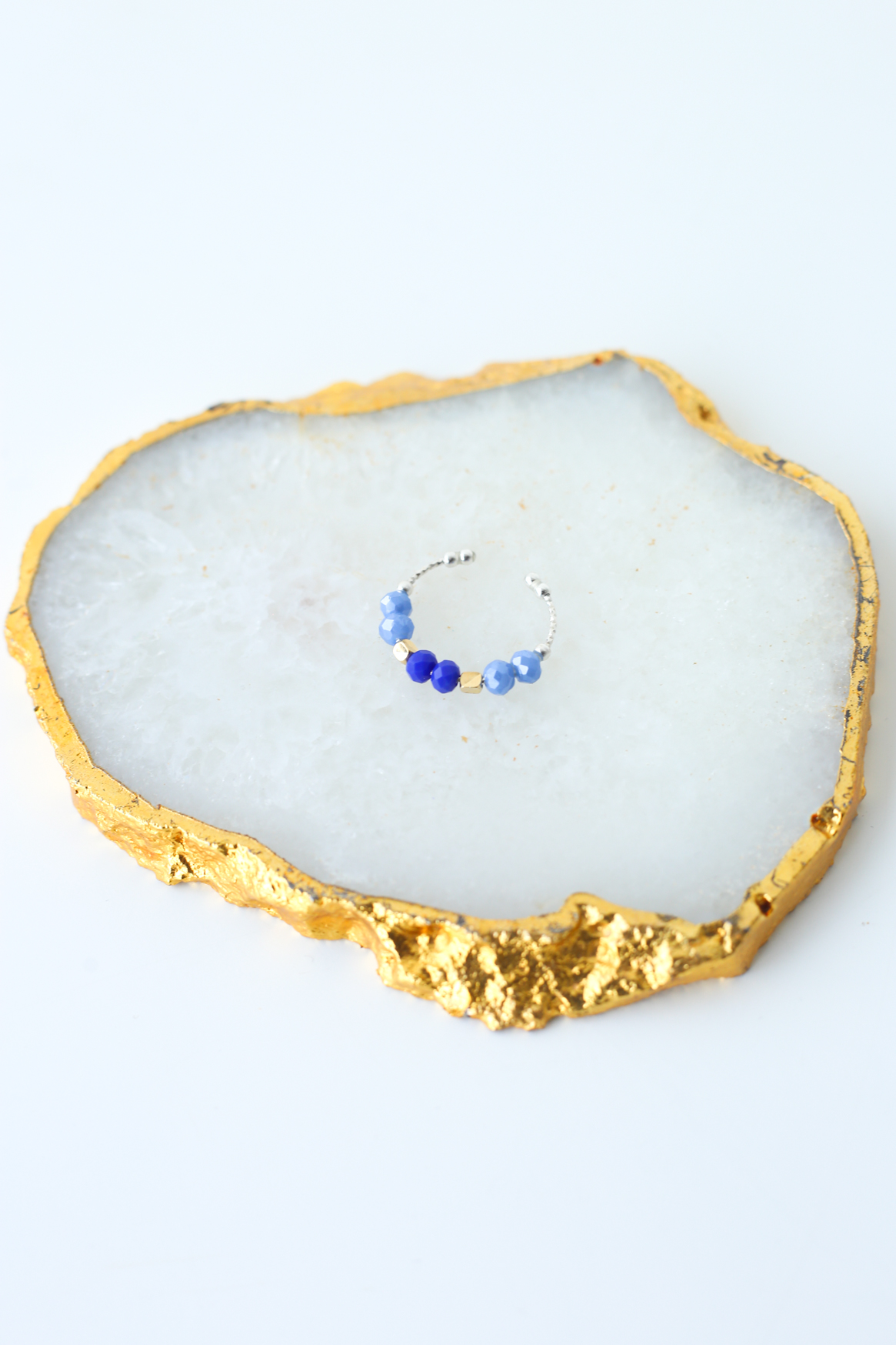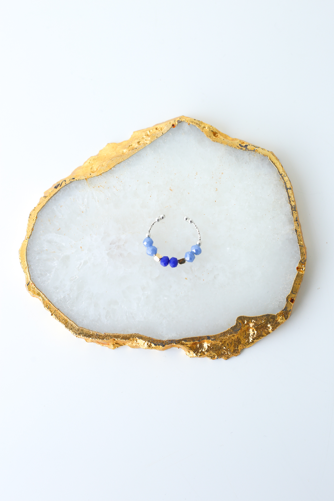 The Saphira Ring is a refined piece inspired by deep blue tones and luminous textures. Featuring faceted beads in rich sapphire shades, paired with gold-plated elements, it creates a striking yet balanced design.