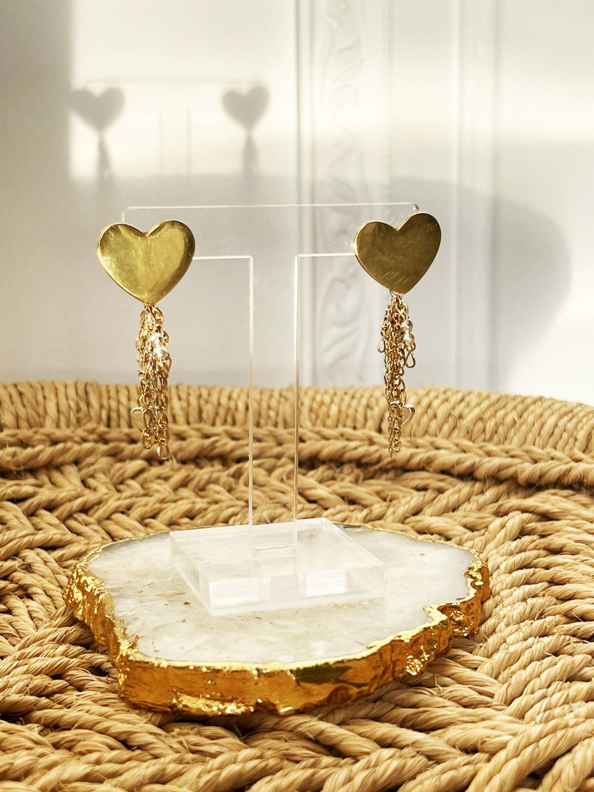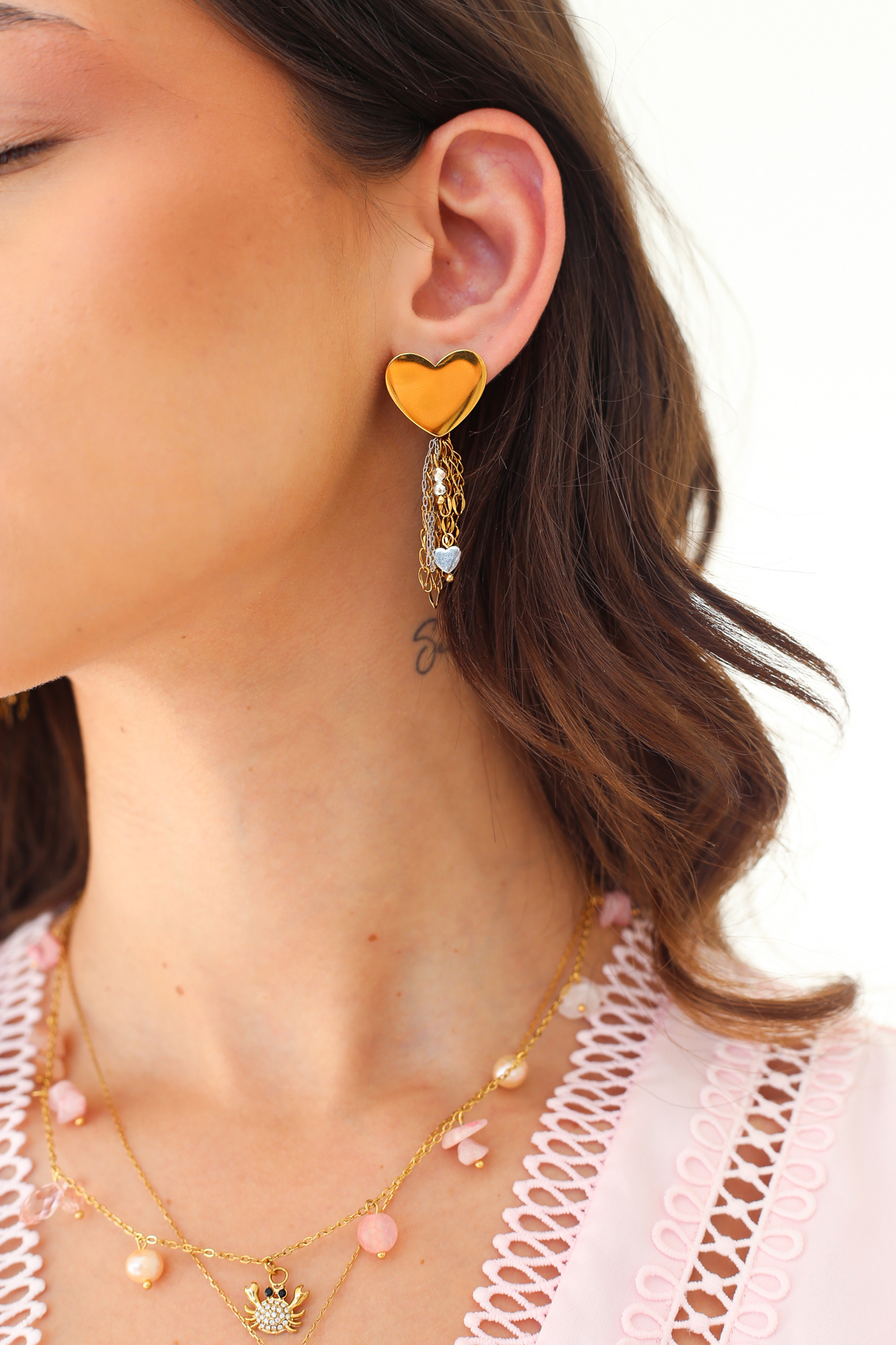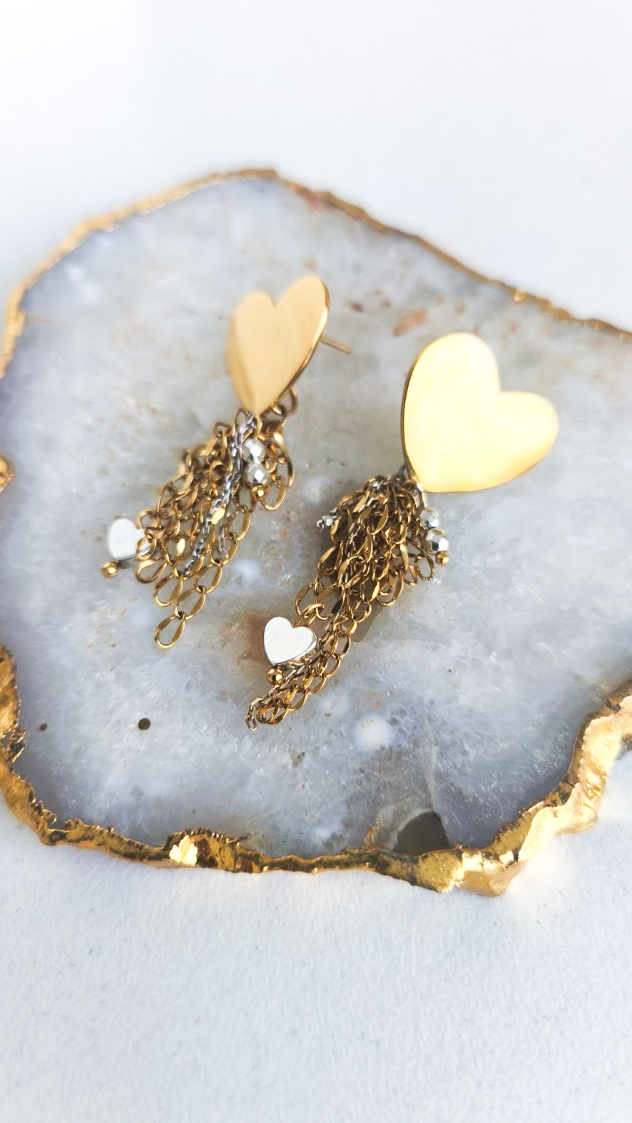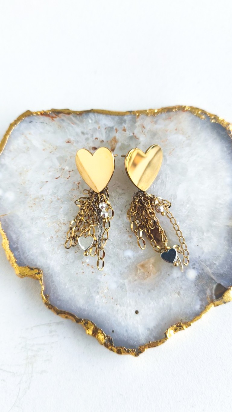A heart set free. Minimal earrings featuring a polished heart and fine chains that move softly with you.