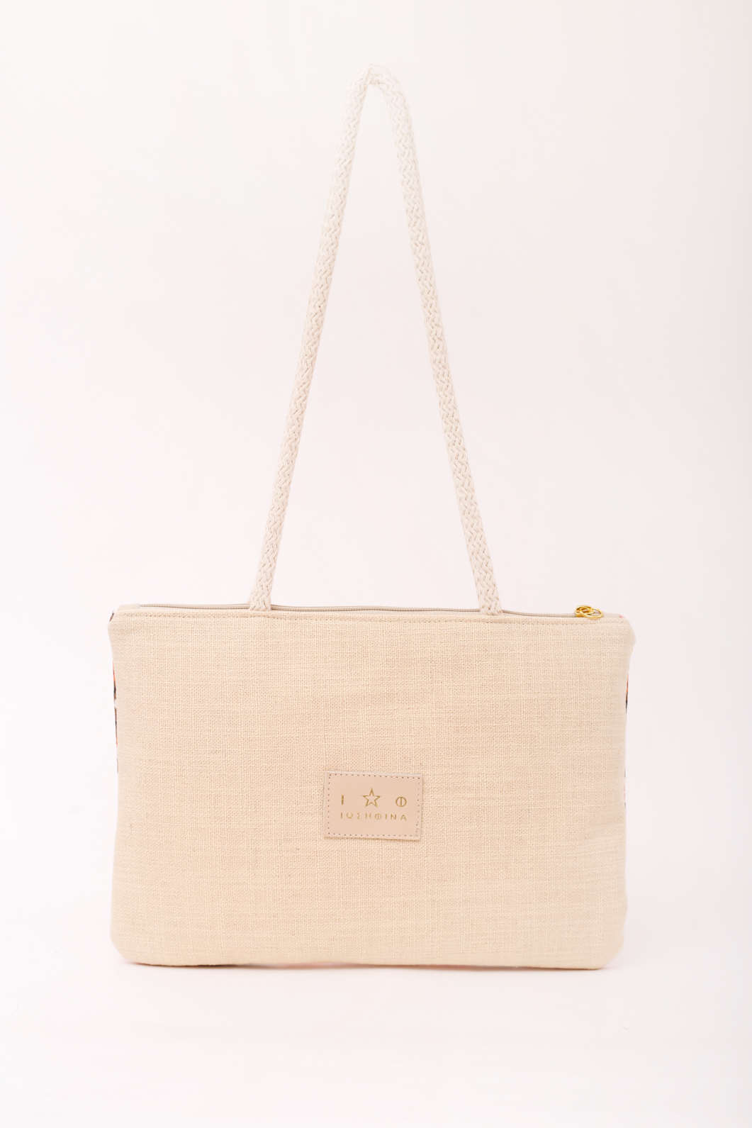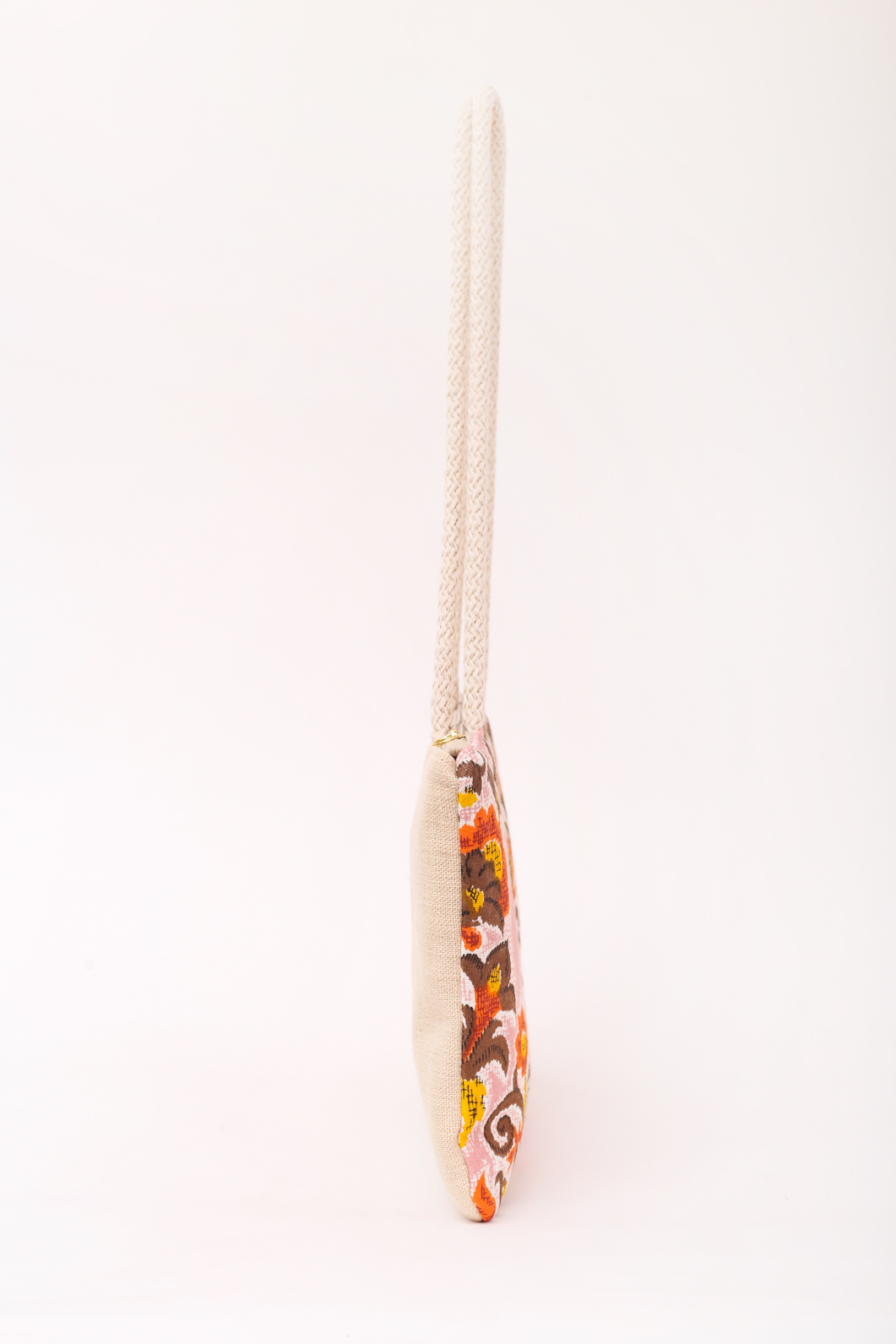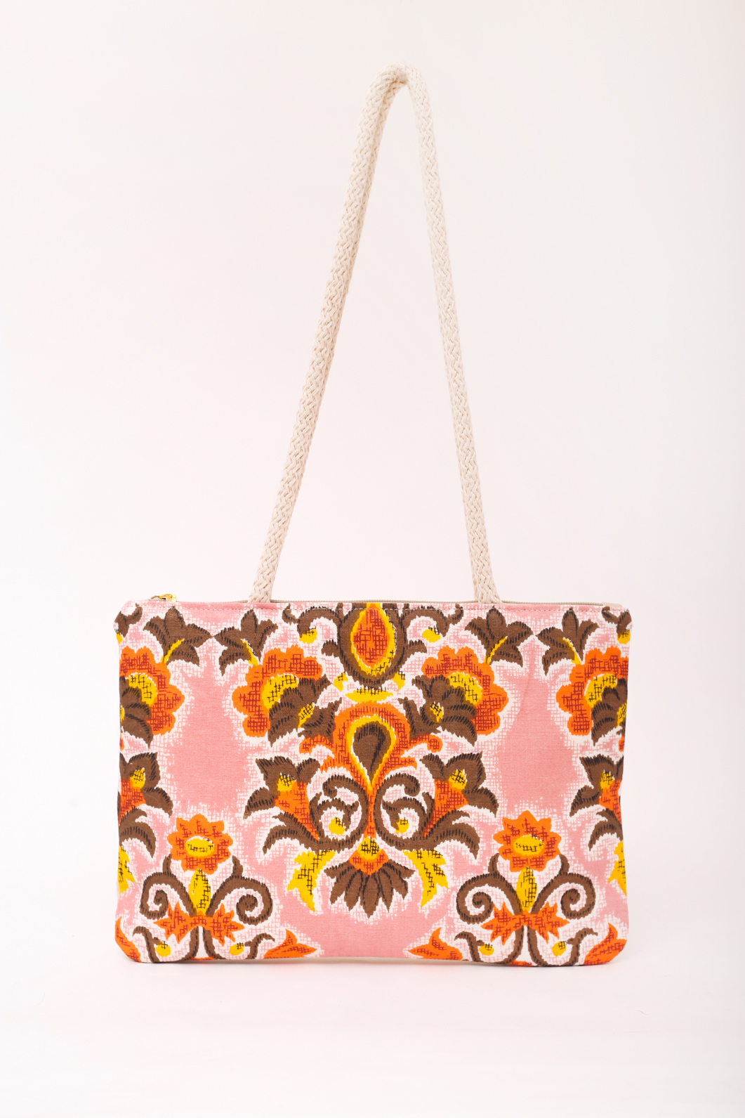 A fresh and feminine shoulder bag designed to bring a soft statement to your everyday style. The Violette Shoulder Bag is crafted from textured fabric in warm coral and pink tones,  featuring a unique floral motif that adds depth and character. The rope-style handles enhance its relaxed, summery feel while offering comfortable wear, making it an ideal choice for both casual outings and holiday looks.